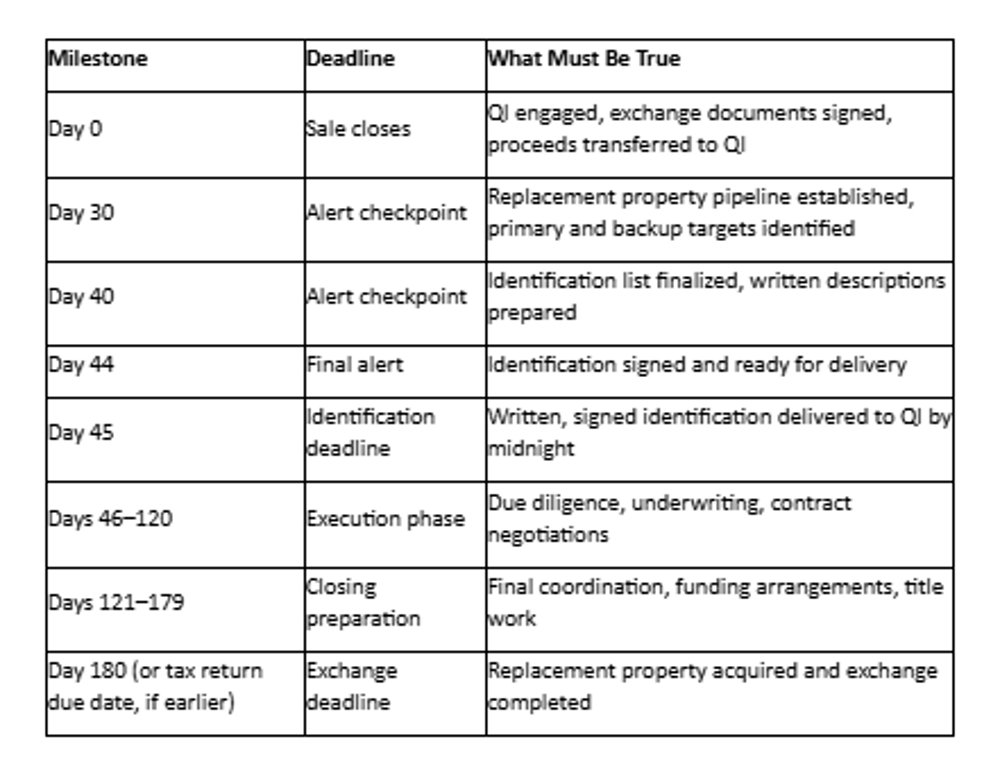 Day 30: Review your replacement property pipeline. Are your targets still available? Have any new opportunities emerged? Confirm top targets and backups are still viable. Request missing diligence documents. Verify who prepares the written identification. This is your last chance to make major adjustments to your strategy.