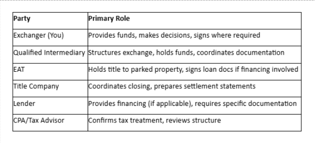 In a reverse exchange, the QI's role expands. They typically work alongside (or provide) the EAT entity, draft the exchange agreement and QEAA documents, coordinate with title and lender on vesting and closing language, and establish the funding and wiring sequence.