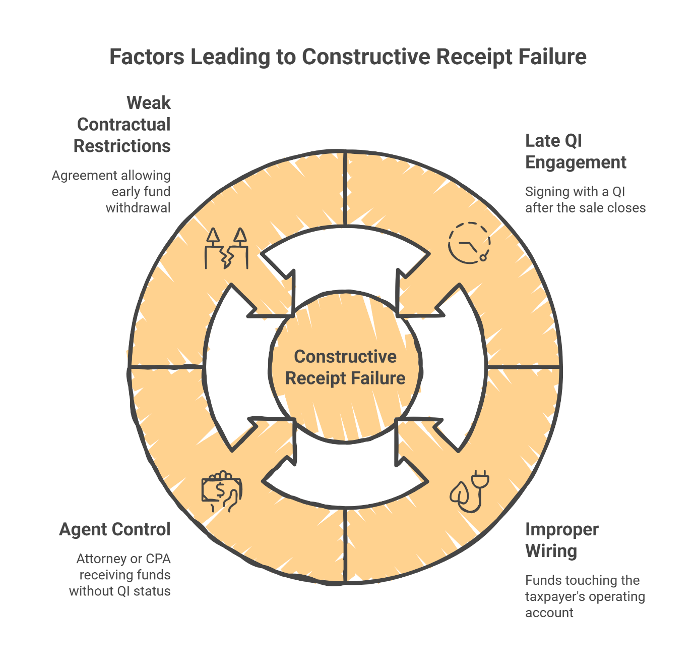 Constructive receipt means you had control over the funds—or could have had control—even if you never touched them. If your sale proceeds hit an account where you're a signatory, you have constructive receipt. If your attorney holds the funds without proper QI documentation, you have constructive receipt. If your QI's procedures allow you to demand the funds before the exchange period ends, you may have constructive receipt.
