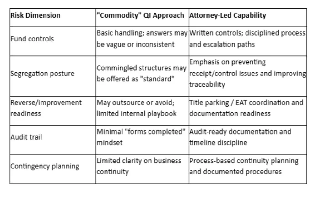 "Commodity" QIs may lack these controls. In the worst cases, a single employee can wire funds without independent verification—creating fraud exposure and operational risk that has nothing to do with IRS compliance.