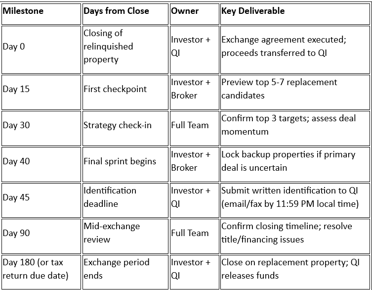 A 1031 Exchange requires clear team coordination. When everyone understands their role—and everyone knows who owns each critical milestone—the process runs smoothly. When roles are unclear, critical tasks fall through the cracks.